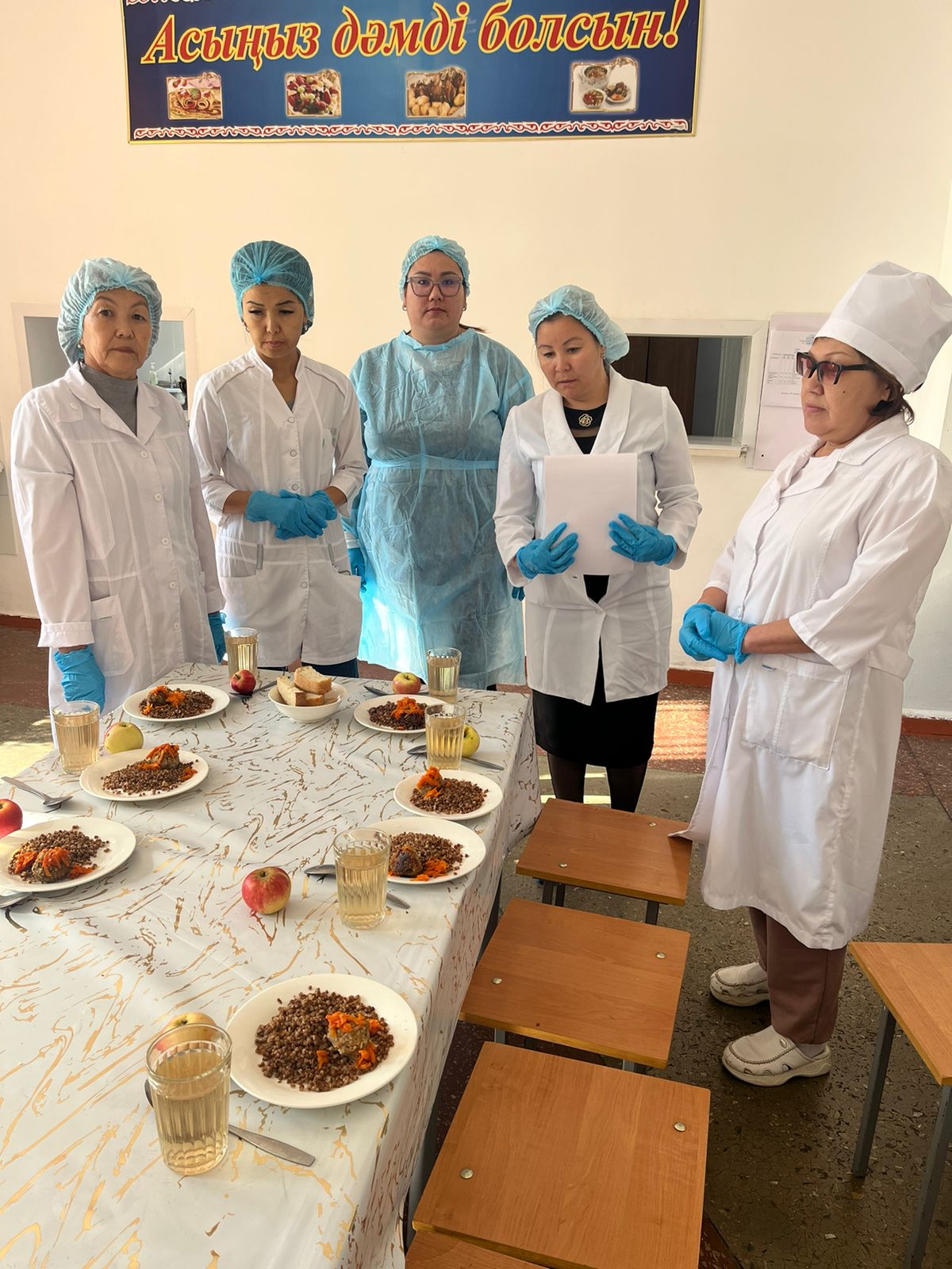 Асхана залында 12 дана ас үстелі, 78 дана орындық, қол жуатын раковина -1 (ыстық сумен боллер арқылы қамтылған), қол кептіретін құрал-1, сұйық сабын-1, қоқыс салатын жәшік орналастырылған. Асханада «Асыңыз дәмді болсын!» тақтасы, ақпараттық стендтер ілінген. Meктеп асханасында 1 аспазшы бар. Асхана қызметкерінің білім дәрежесін растайтын құжаттары бар. Санитарлық кітапшалары талапқа сай, медициналық тексерістен уақытылы өткен. Жұмыс барысында халат, фартук, орамал, екінші аяқ киім киеді. Ас пісіру барысында қолдарына арнайы резеңке бес саусақты қолғап киеді. Ауыстырып отыруға халат, фартук, орамалдары екі данадан бар. Ас дайындау барысында, асхана ішінде санитарлық талаптарды орындайды.